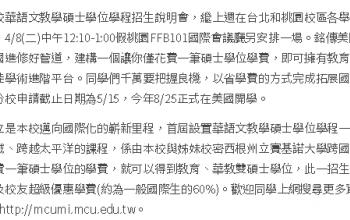 兩場說明會預計在12/17(四)中午12:10於桃園校區EE402,及 12/21(一)中午12:10於桃園校區EE302舉行,開放全校同學參與報名;12/28(一)下午16:00截止收件,面試將於12/30(三)中午12:10於桃園校區P408進行。